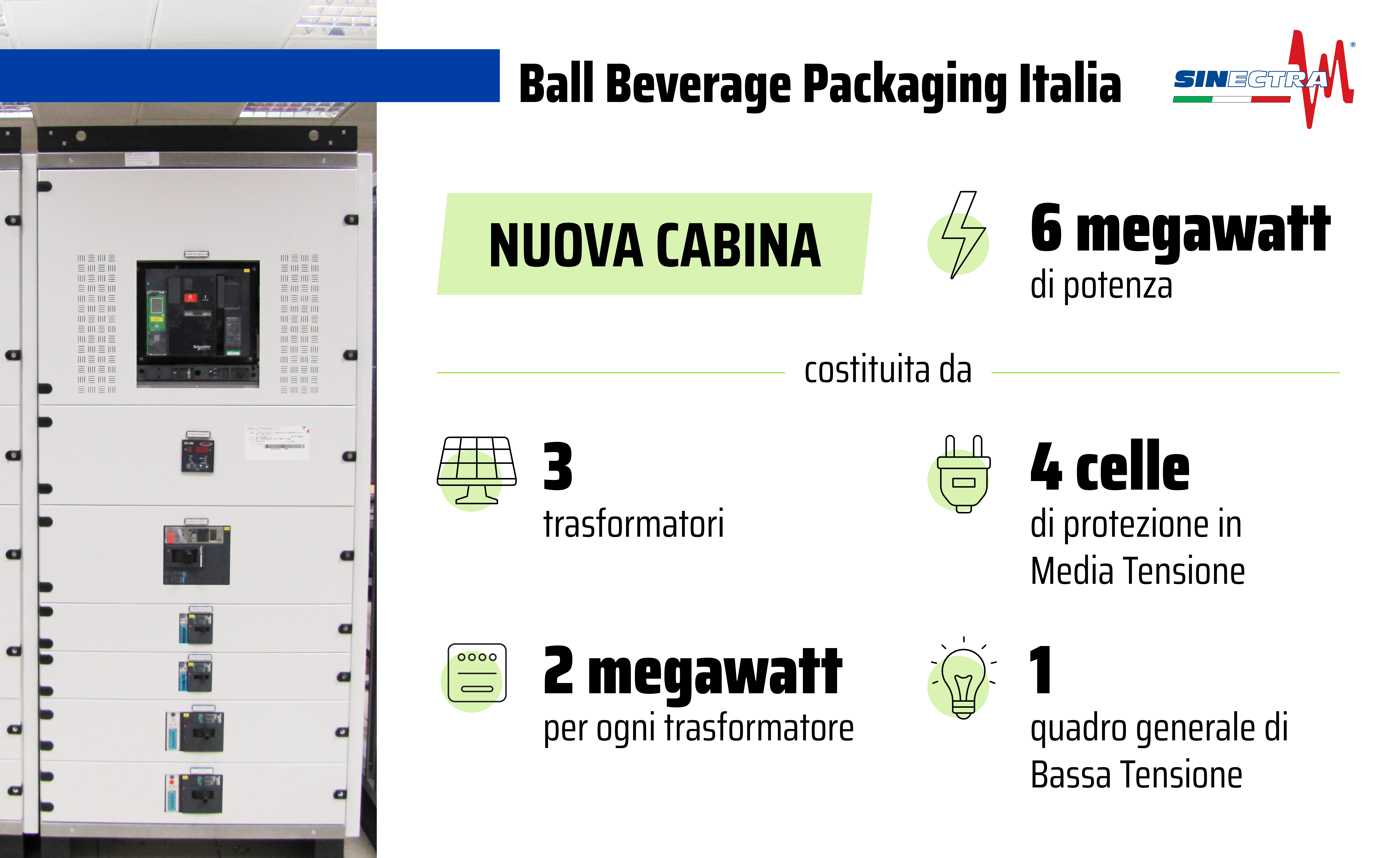 Una squadra condivisa di tecnici di Sinectra e di esperti dell’Area elettrica di Ball, tra Natale e Capodanno, è stata in grado di sostituire, il “cuore” della fabbrica. In cinque giorni, è stata realizzata la nuova cabina, che ha una potenza di 6 megawatt, è costituita da 3 trasformatori da 2 megawatt ciascuno, 4 celle di protezione in media tensione, un Quadro Generale di Bassa Tensione con interruttori intelligenti di nuova generazione dotati di processore di comunicazione per diagnostica consumi e collegamento da remoto che permette di funzionare a tutti gli impianti del grande stabilimento della multinazionale che produce lattine.